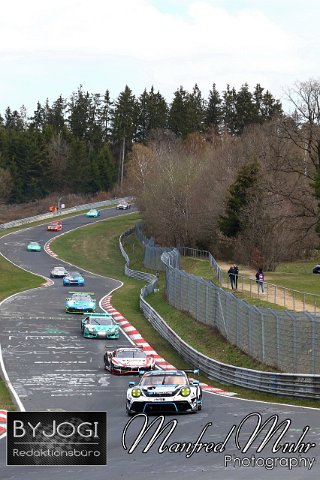 #18 Edoardo Liberati (ITA) / Marco Holzer (AUT), Porsche 911 GT3 R, Team KCMG (CHN) vor #22 Georg Weiss (Monschau) / Daniel Keilwitz (Villingen-Schwenningen) / Jochen Krumbach (Eschweiler), Ferrari 488 GT3, Team: WTM Powered by Phoenix (DEU), Nürburgring Langstrecken Serie NLS, Lauf 2, 45. DMV NIMEX 4-Stunden Rennen, 17.04.2021, Rennen | ||