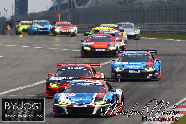 #15 Frank Stipper (Bad Münstereifel) / Dries Vanthoor (BEL) / Frederic Vervisch (BEL), Audi R8 LMS, Team: Audi Sport Team Phoenix (DEU) vor #24 Lorenzo Rocco (CHE) / Patrick Kolb (Bad Homburg) / Patric Niederhauser (CHE), Audi R8 LMS GT3, Team: Lionspeed by Car Collection Motorsport (DEU) und #5 Frank Stippler (Bad Münstereifel) / Vincent Kolb (Frankfurt), Michele Beretta (ITA), Audi R8 LMS, Team: Phoenix Racing (DEU) sowie dem Rest des Feldes, NLS Nürburgring Langstrecken Serie, Lauf 3, 62. Eibach ADAC ACAS Cup, Rennen | ||