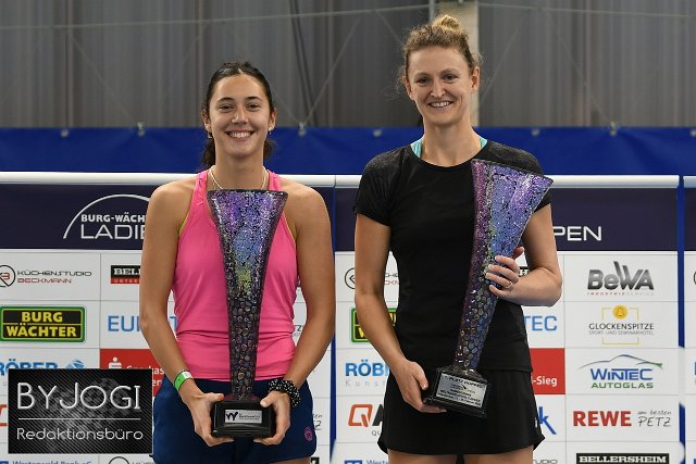 Siegespodest Doppel der Burg-Wächter Ladies Open 2022 mit den Gewinnerinnen Mariam Bolkvadze (GEO/li) und Samantha Murray Sharan (GBR/re), Mariam Bolkvadze (GEO/li) und Samantha Murray Sharan (GBR/re), Burg-Waechter Ladies Open 2022, Altenkirchen, Doppelfinale, Bandecchi/Waltert vs Bolkvadze/Sharan - Foto: Augst/Eibner-Pressefoto | ||