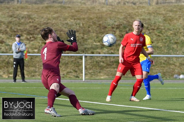 Fussball, Bezirksliga Ost, SG Weitefeld-Langenbach (rot) vs. SG Mueschenbach-Hachenburg (gelb/blau), 13.03.2022 | ||