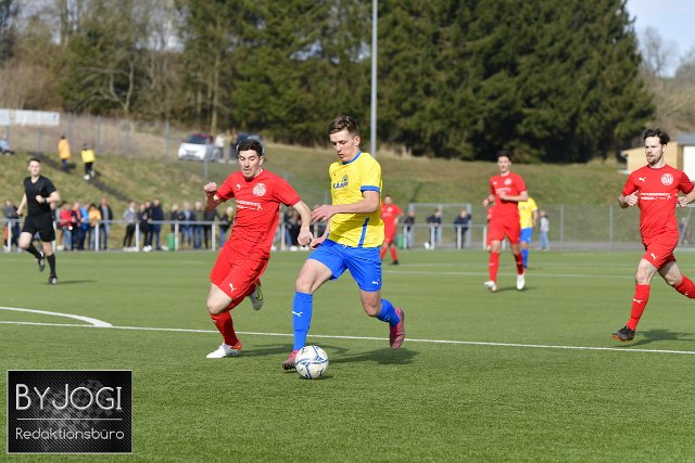 Fussball, Bezirksliga Ost, SG Weitefeld-Langenbach (rot) vs. SG Mueschenbach-Hachenburg (gelb/blau), 13.03.2022 | ||