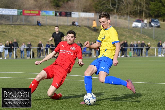 Fussball, Bezirksliga Ost, SG Weitefeld-Langenbach (rot) vs. SG Mueschenbach-Hachenburg (gelb/blau), 13.03.2022 | ||