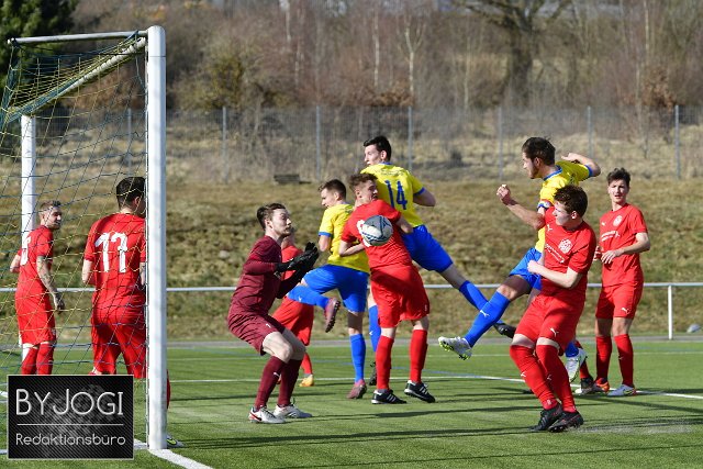Fussball, Bezirksliga Ost, SG Weitefeld-Langenbach (rot) vs. SG Mueschenbach-Hachenburg (gelb/blau), 13.03.2022 | ||
