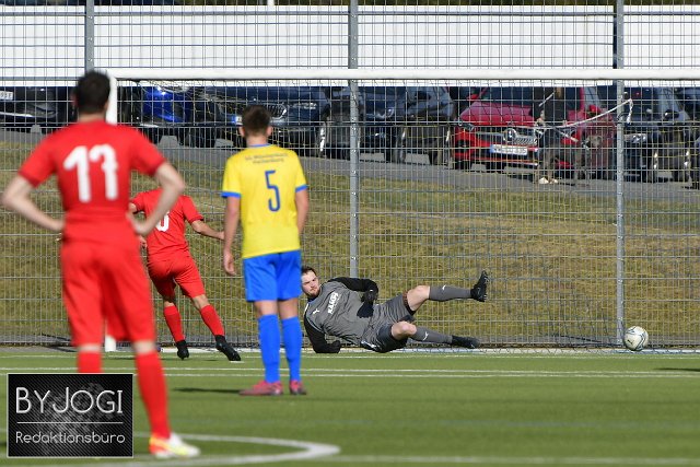 Fussball, Bezirksliga Ost, SG Weitefeld-Langenbach (rot) vs. SG Mueschenbach-Hachenburg (gelb/blau), 13.03.2022 | ||