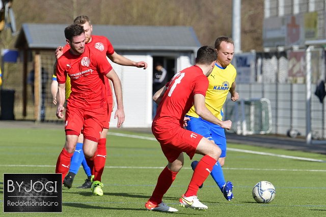 Fussball, Bezirksliga Ost, SG Weitefeld-Langenbach (rot) vs. SG Mueschenbach-Hachenburg (gelb/blau), 13.03.2022 | ||