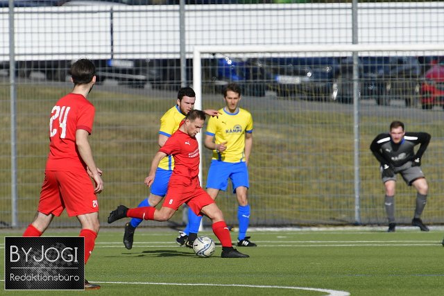 Fussball, Bezirksliga Ost, SG Weitefeld-Langenbach (rot) vs. SG Mueschenbach-Hachenburg (gelb/blau), 13.03.2022 | ||