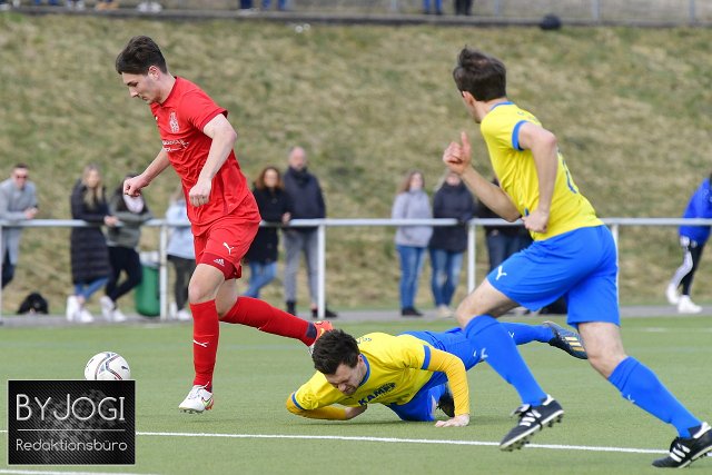 Fussball, Bezirksliga Ost, SG Weitefeld-Langenbach (rot) vs. SG Mueschenbach-Hachenburg (gelb/blau), 13.03.2022 | ||