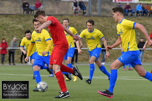Fussball, Bezirksliga Ost, SG Weitefeld-Langenbach (rot) vs. SG Mueschenbach-Hachenburg (gelb/blau), 13.03.2022 | ||