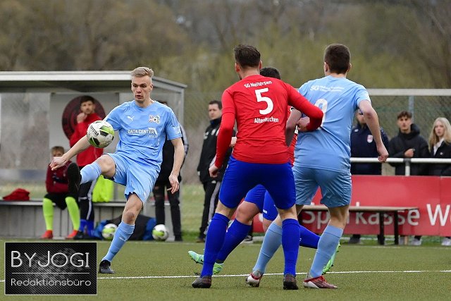Fussball, Rheinlandliga, SG Neitersen/Altenkirchen (rot/blau) vs. SG Malberg (hellblau), 06.04.2022 | ||