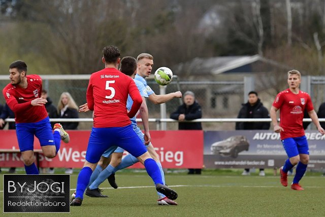 Fussball, Rheinlandliga, SG Neitersen/Altenkirchen (rot/blau) vs. SG Malberg (hellblau), 06.04.2022 | ||