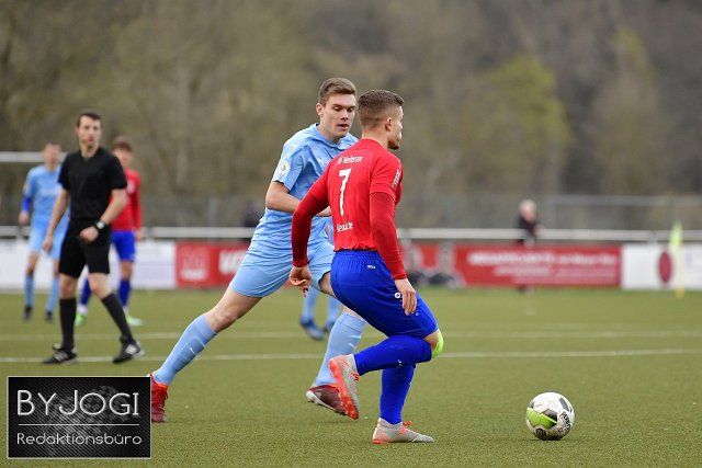 Fussball, Rheinlandliga, SG Neitersen/Altenkirchen (rot/blau) vs. SG Malberg (hellblau), 06.04.2022 | ||