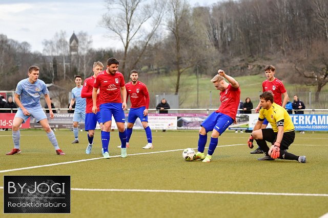 Fussball, Rheinlandliga, SG Neitersen/Altenkirchen (rot/blau) vs. SG Malberg (hellblau), 06.04.2022