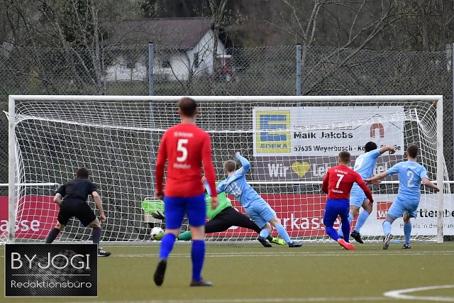 Fussball, Rheinlandliga, SG Neitersen/Altenkirchen (rot/blau) vs. SG Malberg (hellblau), 06.04.2022 | ||