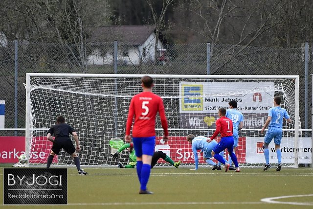 Fussball, Rheinlandliga, SG Neitersen/Altenkirchen (rot/blau) vs. SG Malberg (hellblau), 06.04.2022