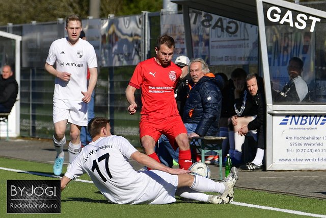 Fussball, Bezirksliga Ost, SG Weitefeld (rot) vs. SC Windhagen (weiß), 16.04.2022 | ||