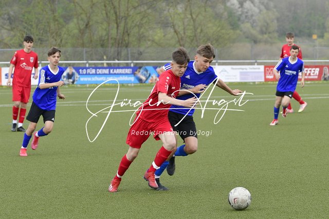 Fussball, Rheinlandpokal Viertelfinale, C-Junioren, JSG Neitersen-Altenkiirchen (rot) vs. Spfr. Eisbachtal (blau/schwarz), 23.04.2022 | ||