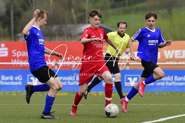 Fussball, Rheinlandpokal Viertelfinale, C-Junioren, JSG Neitersen-Altenkiirchen (rot) vs. Spfr. Eisbachtal (blau/schwarz), 23.04.2022 | ||