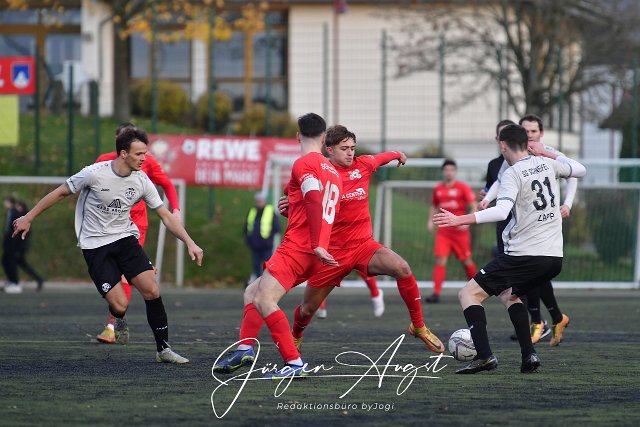 Fussball, Rheinlandliga, SG Malberg (rot) vs. SC Schneifel Stadtkyll (weiß/schwarz), 26.11.2022 | ||
