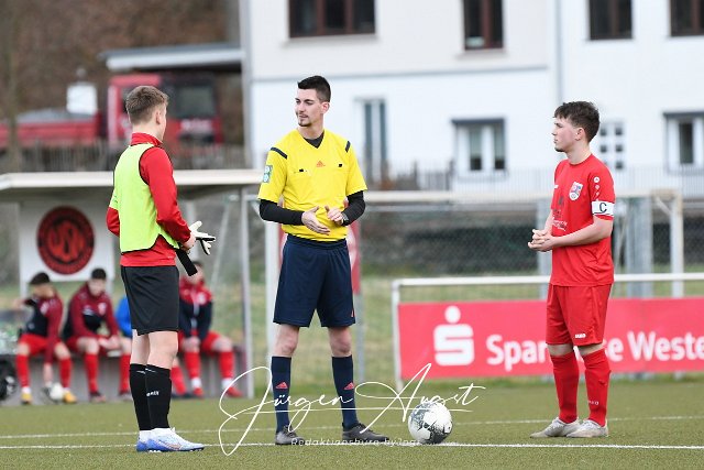 Fussball, Rheinlandliga B-Junioren, JSG Neitersen (rot) vs. FC Rot-Weiss Koblenz )schwarz), 18.03.2023 | ||