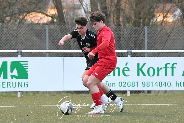 Fussball, Rheinlandliga B-Junioren, JSG Neitersen (rot) vs. FC Rot-Weiss Koblenz )schwarz), 18.03.2023 | ||