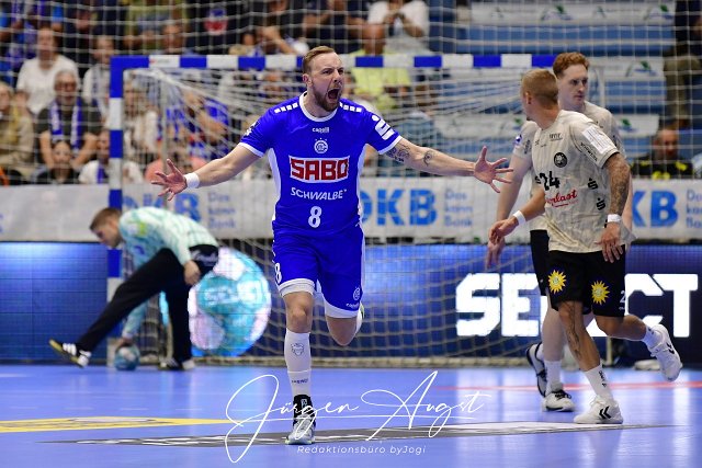 Lukas Blohme (VfL Gummersbach / #8) jubelt, VfL Gummersbach vs. Bergischer HC, Handball, Bundesliga, 5. Spieltag, Saison 2023/24, 14.09.2023 Foto: Eibner-Pressefoto/Juergen Augst | ||