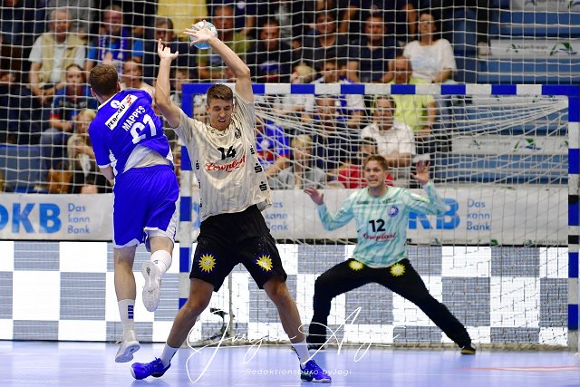 Dominik Mappes (VfL Gummersbach / #21) gegen #14 Frederik Ladefoged (Berischer HC / #14) und Peter Johannesson (Bergischer HC / #12) VfL Gummersbach vs. Bergischer HC, Handball, Bundesliga, 5. Spieltag, Saison 2023/24, 14.09.2023 Foto: Eibner-Pressefoto/Juergen Augst | ||