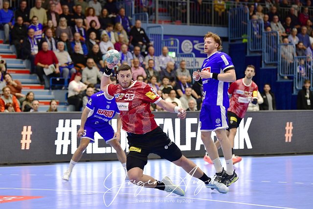 Setzt sich am Kreis durch, Mijajlo Marsenic (Fuechse Berlin 93) gegen Tom Kiesler (VfL Gummersbach 30) Handball, 1 Bundesliga, VfL Gummersbach vs. Fuechse Berlin, 11. Spieltag, Schwalbe Arena Gummersbach, 27.10..2023 Foto: Eibner-Pressefoto/Juergen Augst | ||