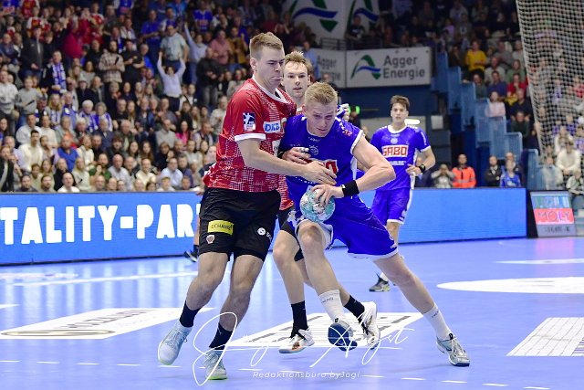 Ellidi Vidarsson (VfL Gummersbach 4) gegen Max Beneke (Fuechse Berlin 27) Handball, 1 Bundesliga, VfL Gummersbach vs. Fuechse Berlin, 11. Spieltag, Schwalbe Arena Gummersbach, 27.10..2023 Foto: Eibner-Pressefoto/Juergen Augst | ||