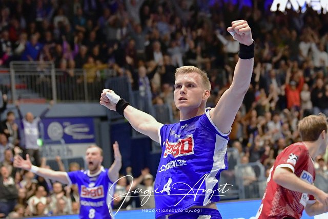 Ellidi Vidarsson (VfL Gummersbach 4) und im Hintergrund Lukas Blohme (VfL Gummersbach 8) jubeln Handball, 1 Bundesliga, VfL Gummersbach vs. Fuechse Berlin, 11. Spieltag, Schwalbe Arena Gummersbach, 27.10..2023 Foto: Eibner-Pressefoto/Juergen Augst | ||