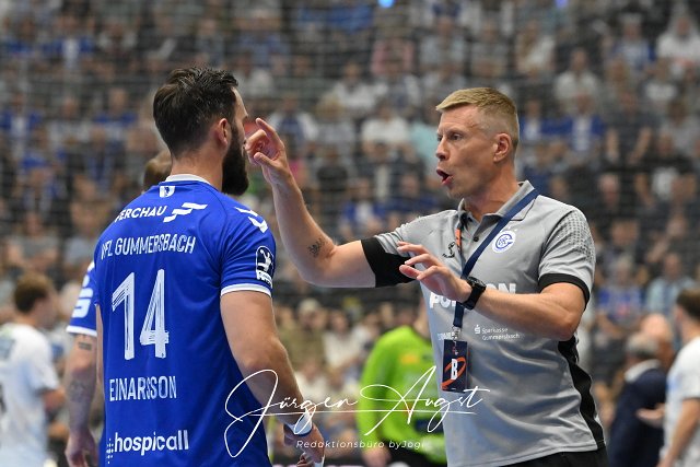 Gudjon Valur Sigurdsson (VfL Gummersbach Trainer) instruiert Teitur Einarsson (VfL Gummersbach 14) Handball, EHF European Handball Federation, 2024-2025, Qualifikation, Rueckspiel, VfL Gummersbach vs. Mors-Thy Handbold, Schwalbe Arena Gummersbach, .08.09.2024 Foto: Eibner-Pressefoto/Juergen Augst | ||