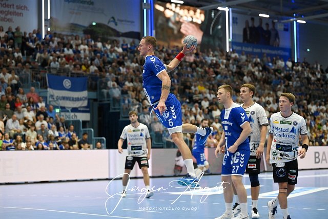 Herr der Luefte, Tilen Kodrin (VfL Gummersbach 5) Handball, EHF European Handball Federation, 2024-2025, Qualifikation, Rueckspiel, VfL Gummersbach vs. Mors-Thy Handbold, Schwalbe Arena Gummersbach, .08.09.2024 Foto: Eibner-Pressefoto/Juergen Augst | ||