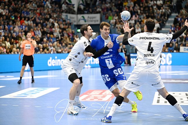 Julian Koester (VfL Gummersbach 7) gegen Hendrik Pekeler (THW Kiel 61) und Domagoj Duvnjak (THW Kiel 4) GER, VfL Gummersbach vs. THW Kiel, Handball, Daikin 1. Bundesliga, 11. Spieltag, Spielzeit 2024/25, 22.11.2024 Foto: Eibner-Pressefoto/Juergen Augst | ||