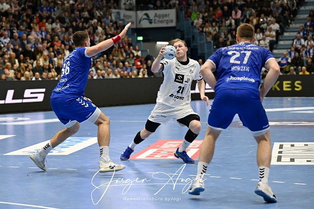 Eric Johansson (THW Kiel 21) gegen Stepan Zeman (VfL Gummersbach 66) GER, VfL Gummersbach vs. THW Kiel, Handball, Daikin 1. Bundesliga, 11. Spieltag, Spielzeit 2024/25, 22.11.2024 Foto: Eibner-Pressefoto/Juergen Augst | ||