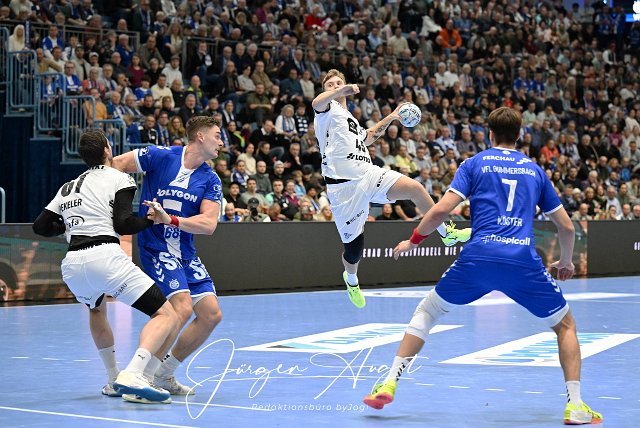 Emil Wernsdorf Madsen (THW Kiel, #45) kommt aus der zweiten Reihe zum Wurf GER, VfL Gummersbach vs. THW Kiel, Handball, Daikin 1. Bundesliga, 11. Spieltag, Spielzeit 2024/25, 22.11.2024 Foto: Eibner-Pressefoto/Juergen Augst | ||