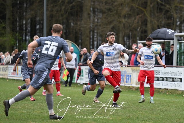 Fussball, Bezirksliga Ost, SG Berod-Wahlrod-Lautzert-Oberdreis (weiß/rot) vs. SG Hundsangen (grau), 13.04.2025 | ||