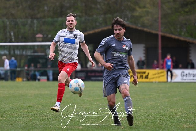 Fussball, Bezirksliga Ost, SG Berod-Wahlrod-Lautzert-Oberdreis (weiß/rot) vs. SG Hundsangen (grau), 13.04.2025 | ||